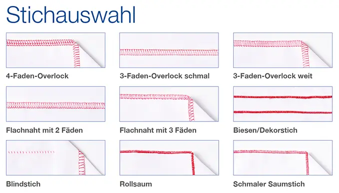 Mit der 4234D können Sie alle folgenden Stiche nähen: 4-Faden-Overlock, 3-Faden-Overlock schmal, 3-Faden-Overlock breit, 2-Faden-Flachnaht, 3-Faden-Flachnaht, Biesen, Blindsaum, Rollsaum und schmaler Saum.