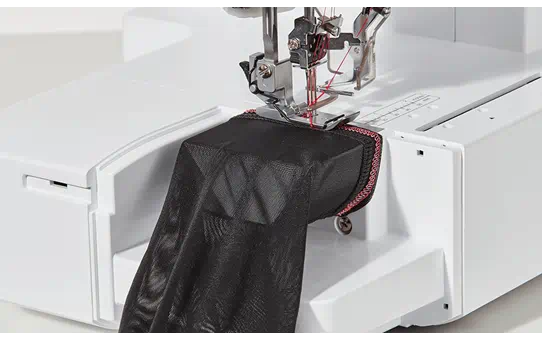 Diese doppelseitige Coverstich-Maschine bietet einen großzügigen Arbeitsbereich, mit dem auch große Projekte mühelos zu bewältigen sind. Der Freiarm macht das Nähen von Halsausschnitten, Manschetten und Säumen einfach.