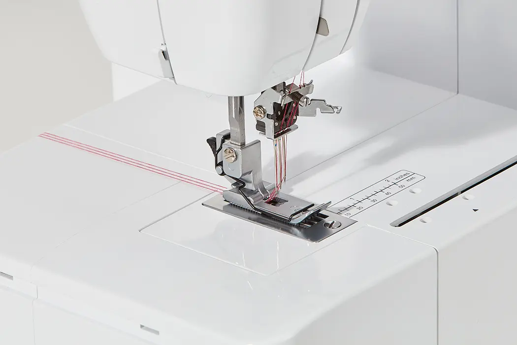 Coverstich mit zwei Nadeln und drei Fäden. Optimal für das Säumen feiner Stoffe, Bandeinfassung und Absteppen.