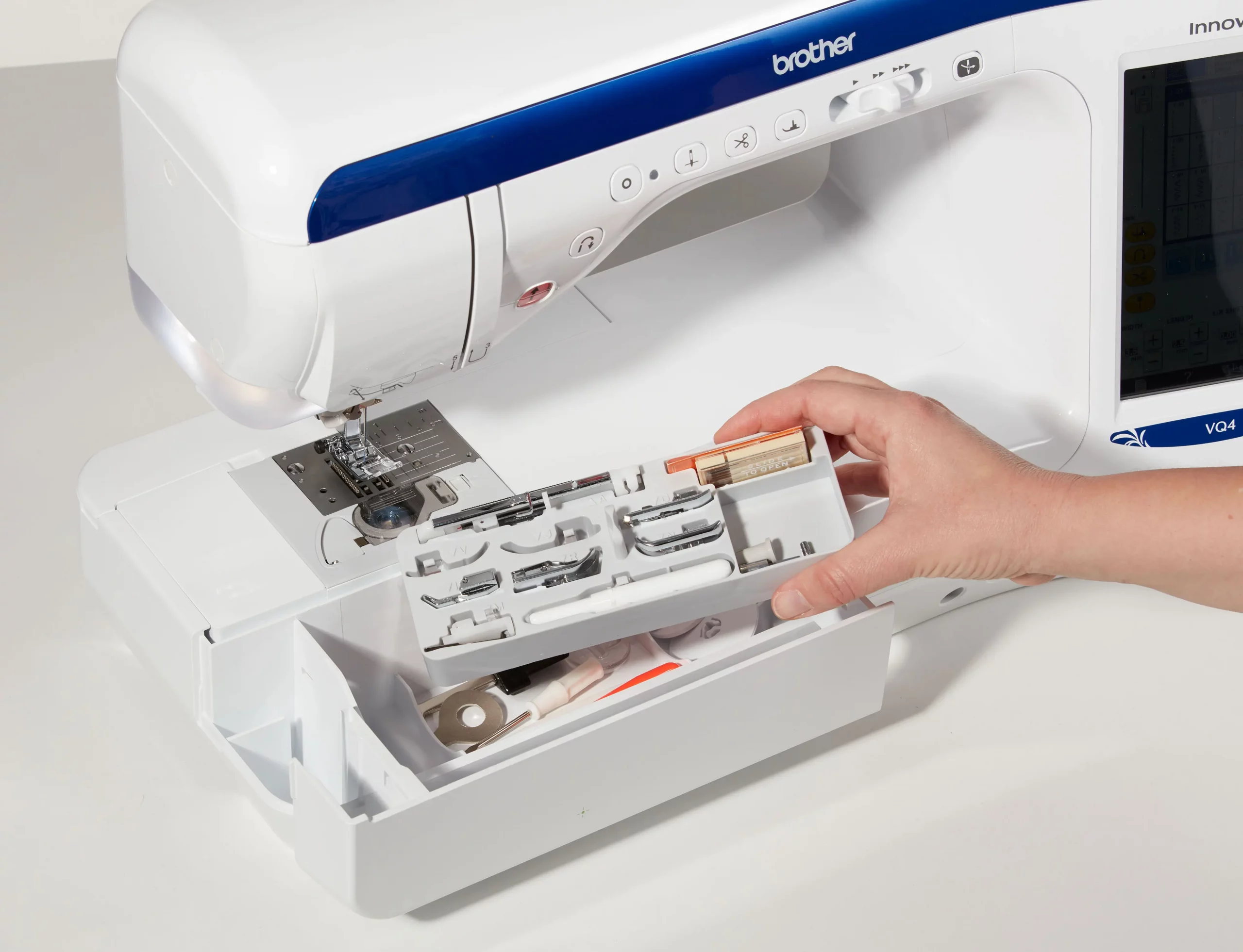 Die Innov-is VQ4 wird mit einer breiten Palette an Zubehör geliefert – Quiltfüße für den digitalen Doppeltransportfuß, ein Geradstich-Nähfuß für dünne Stoffe oder kleine Ansetzteile, eine Multi-Fußanlasser-Steuerung und ein Kniehebel, mit dem die Hände für perfekte und präzise Ergebnisse an Ihrem Projekt bleiben können.