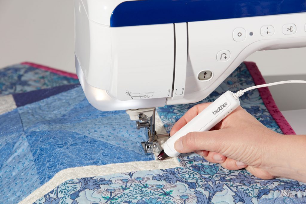 Die Brother Innov-is VQ4 vereint Funktionen auf professionellem Niveau, wie z. B. Laser-Führungslinie, Ultraschall-Sensorstift und elektronischer Obertransport für perfekte Nähergebnisse.