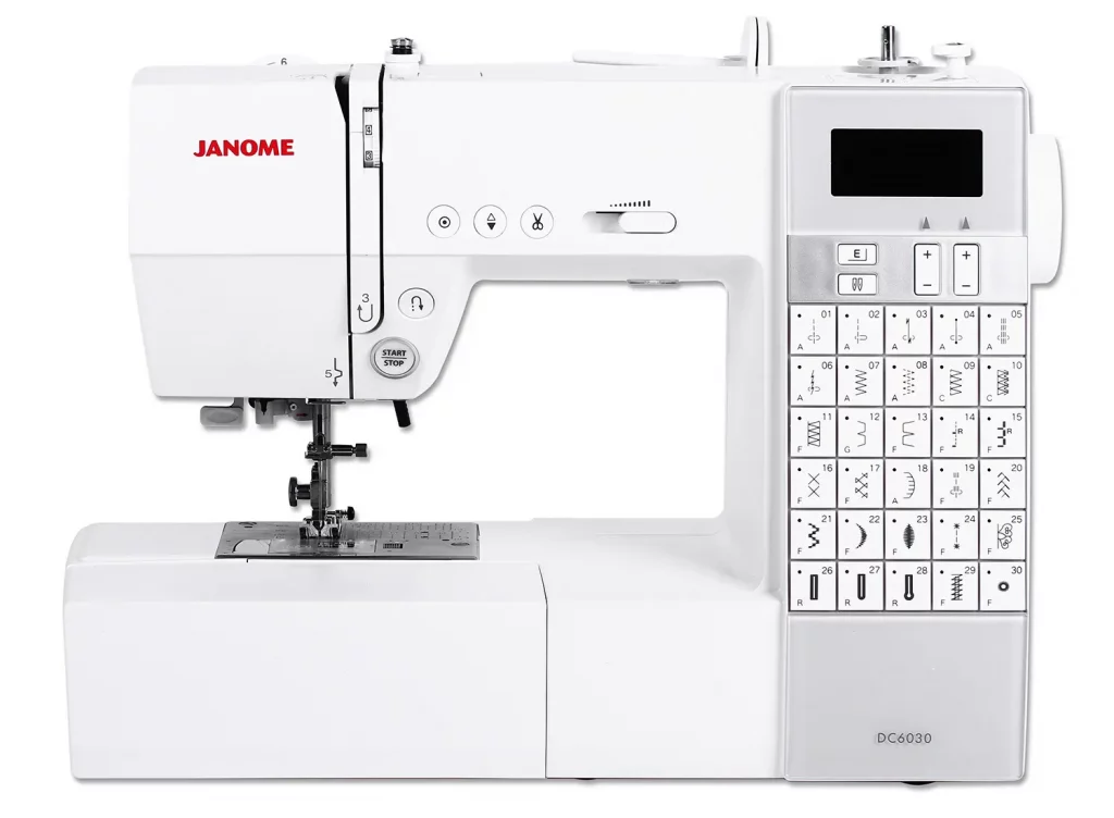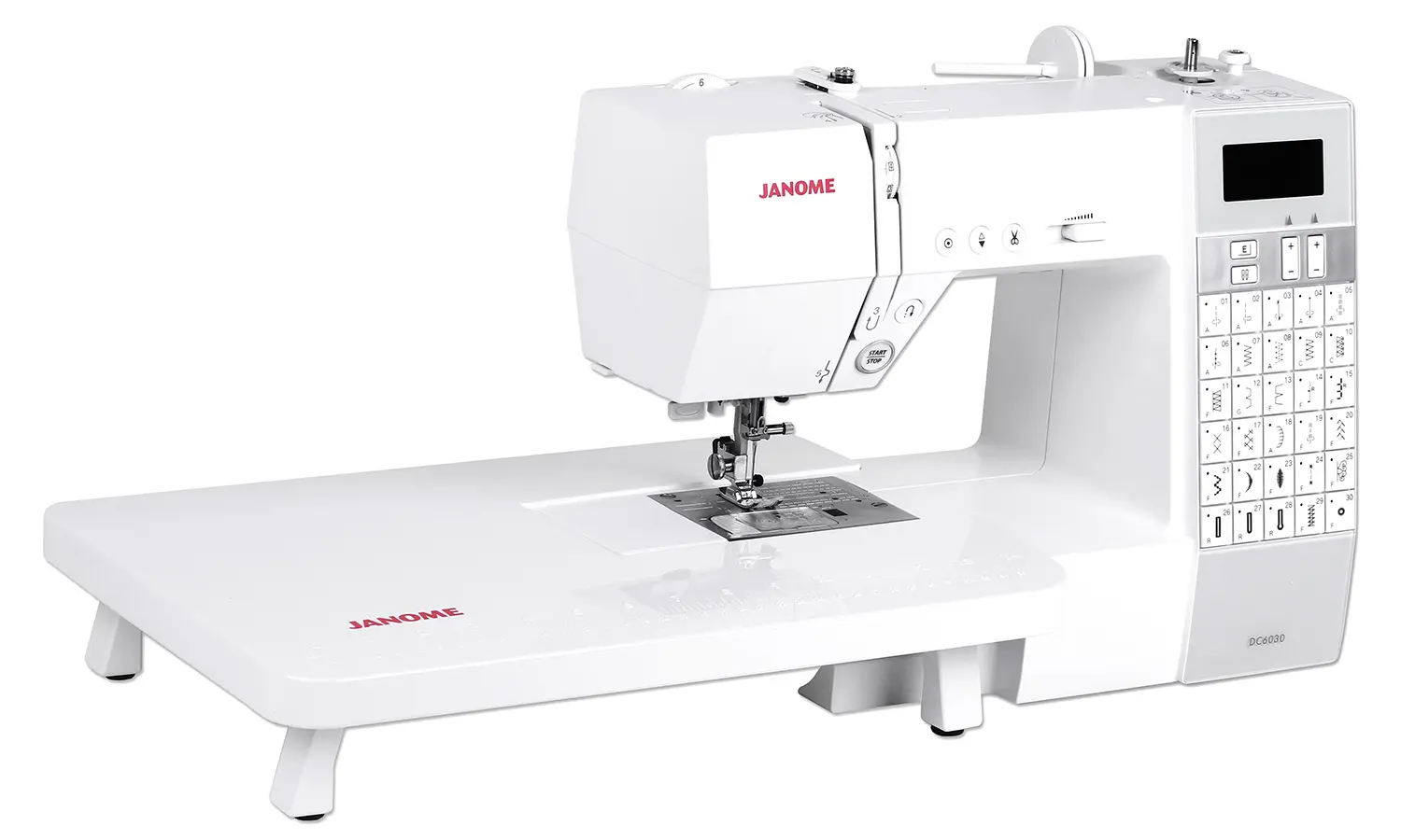 Die Computer-Nähmaschine DC6030 besticht durch das moderne Design und die einfache Bedienung. 30 Direkttasten für schnelle Stichwahl per simplen Druck. Sofort stellt die Nähmaschine den Stich optimal ein und das LC-Display wird zum kleinen Nähberater. Neben Stichbreite- und länge wird der zur Nähtechnik passende Fuß angezeigt. So praktisch für Anfänger und Wiedereinsteiger. Lassen Sie sich doch bei einer Beratung im Janome Fachhandel von der Vielseitigkeit einer DC6030 überzeugen.