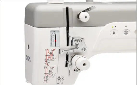 | Nähfuß heben/senken | Mechanisch per Hand, zusätzlich mechanischer Kniehebel |