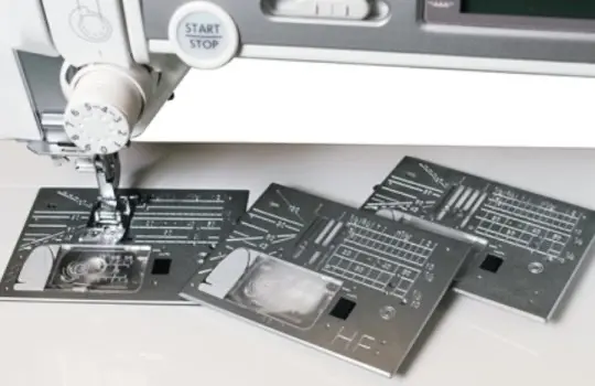 Die Janome 6700P hat die Standardstichplatte, Geradstichplatte mit linker, mittlerer, rechter Nadelposition und die HP Profigeradstichplatte.