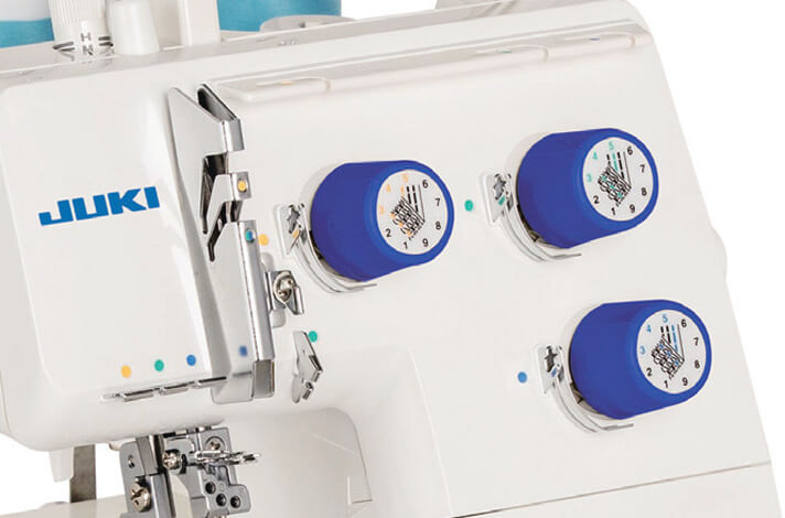 Die Fadenspannung bei der JUKI Coverlock MCS-1800 ist einfach zu bedienen. Die Coverlock Maschine hat für die Greifer- und Nadelfäden übersichtliche Drehknöpfe wo sogar markiert ist, für welchen Faden jeder Knopf zuständig ist. Sogar die Grundeinstellungen sind darauf hervor gehoben.