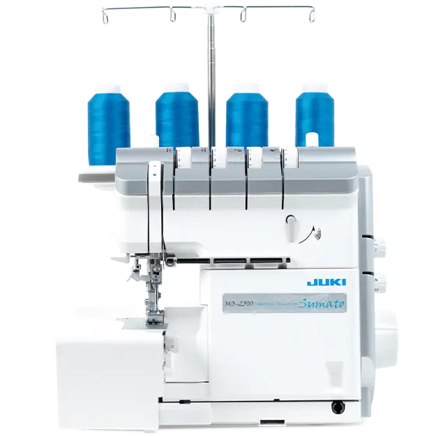 Stichauswahl – 4-Faden-Overlock, 3-Faden-Overlock schmal, 3-Faden-Overlock breit, 2-Faden-Flatlock, 3-Faden-Flatlock, Biesenstich, Blindsaum, Rollsaum und Wellensaum.