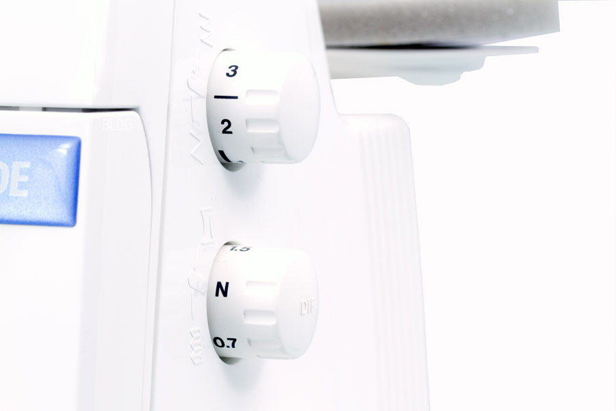 Das Einstellen der Fadenspannung ist immer eine knifflige Sache. Gerade wenn eine Naht einmal nicht genauso aussieht wie gewünscht. Damit es trotzdem einfach ist, die Spannung für den richtigen Faden anzupassen, hat die MO-734DE Overlock-Maschine für die Greifer- und für die Nadelfäden verschiedene, übersichtlich angeordnete Fadenspannungen. An diesen Stellknöpfen ist zusätzlich noch aufgedruckt, für welchen Faden dieser zuständig ist. Außerdem ist die Grundeinstellung der jeweiligen Fadenspannung hervorgehoben, sodass Sie diese jederzeit selbständig wiederherstellen können.