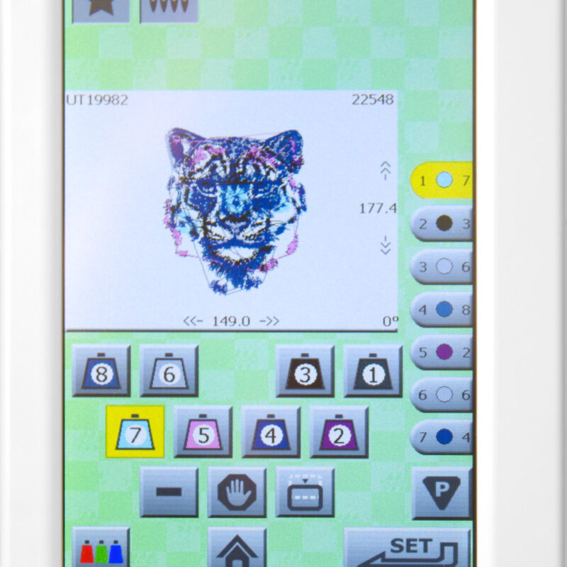 Im Lieferumfang enthalten ist dazugehörige Sticksoftware „Tajima Writer Plus“. Mit dieser Software können Sie Bilder, Zeichnungen, Schriften ganz einfach in eine Stickdatei umwandeln, anschließend auf dem USB Stick speichert und dann in die Maschine geben oder mittels LAN-Kabel direkt an die Maschine oder mehre Maschinen senden. Der hochauflösende Touchscreen (3,5x6Zoll) lässt ein weiteres Bearbeiten der Stickmotive zu. Spiegeln, Drehen, Vergrößern oder verkleinern Sie Motive nach Herzenslust. Wenn Sie Veränderungen in der Größe vornehmen, werden die Stiche für gleichbleibende Stichdichte nachberechnet. Außerdem haben Sie die Möglichkeit die Stickerei direkt am Display als Simulation darzustellen. Für die perfekte Positionierung Ihrer Stickerei sorgt das eingebaute Positionslaser-System.